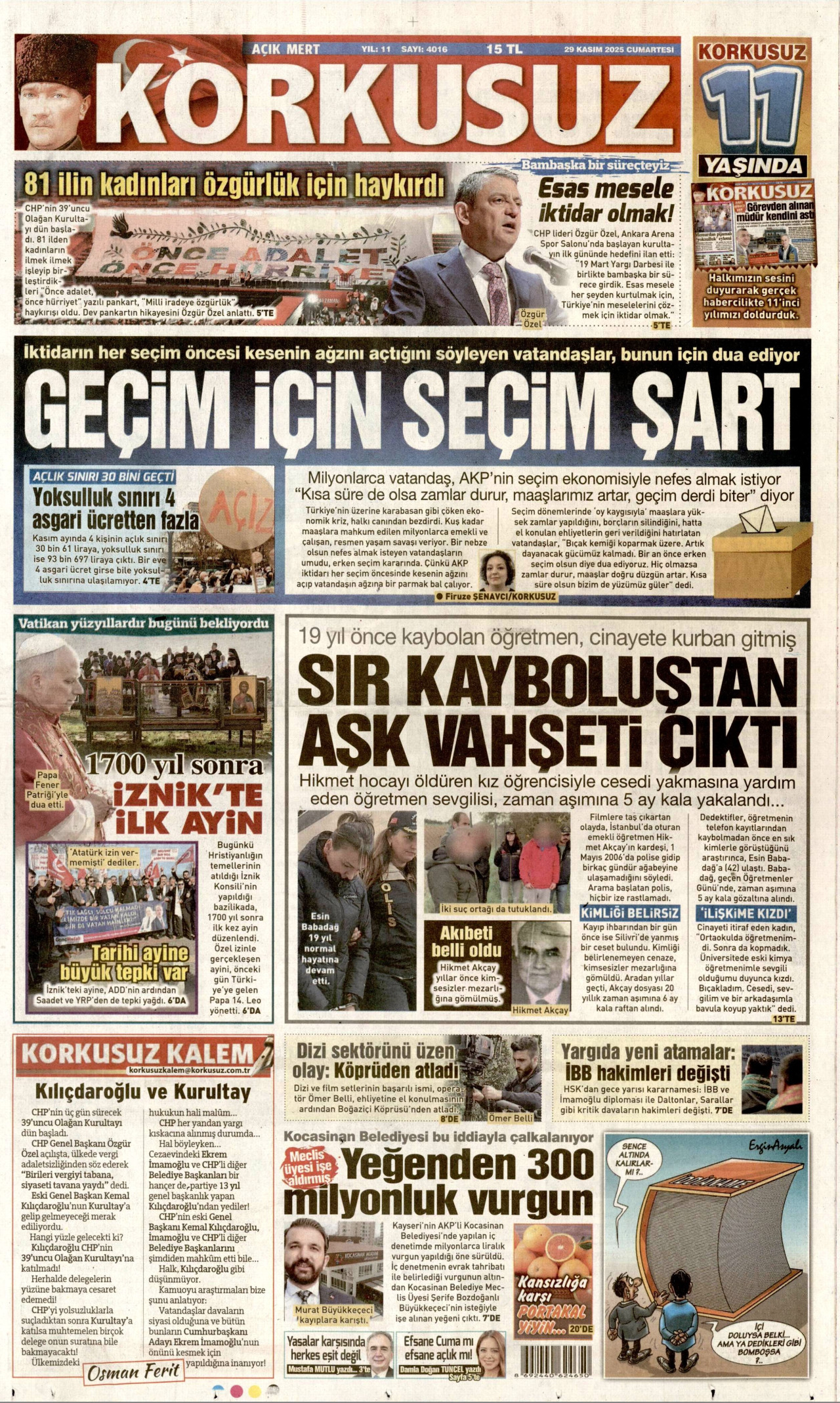 KORKUSUZ Gazetesi 29 Kasım 2025, Cumartesi Günü Manşeti
